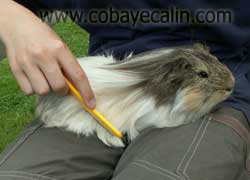 Par contre, les cobayes à poils longs, comme les Sheltys ou les Péruviens ont grand besoin d'un coup de brosse ou de peigne, sans quoi les poils s'emmellent, surout si vous utilisez de la litière genre "copeaux", ce qui occasionne de la gêne à nos petits amis.
